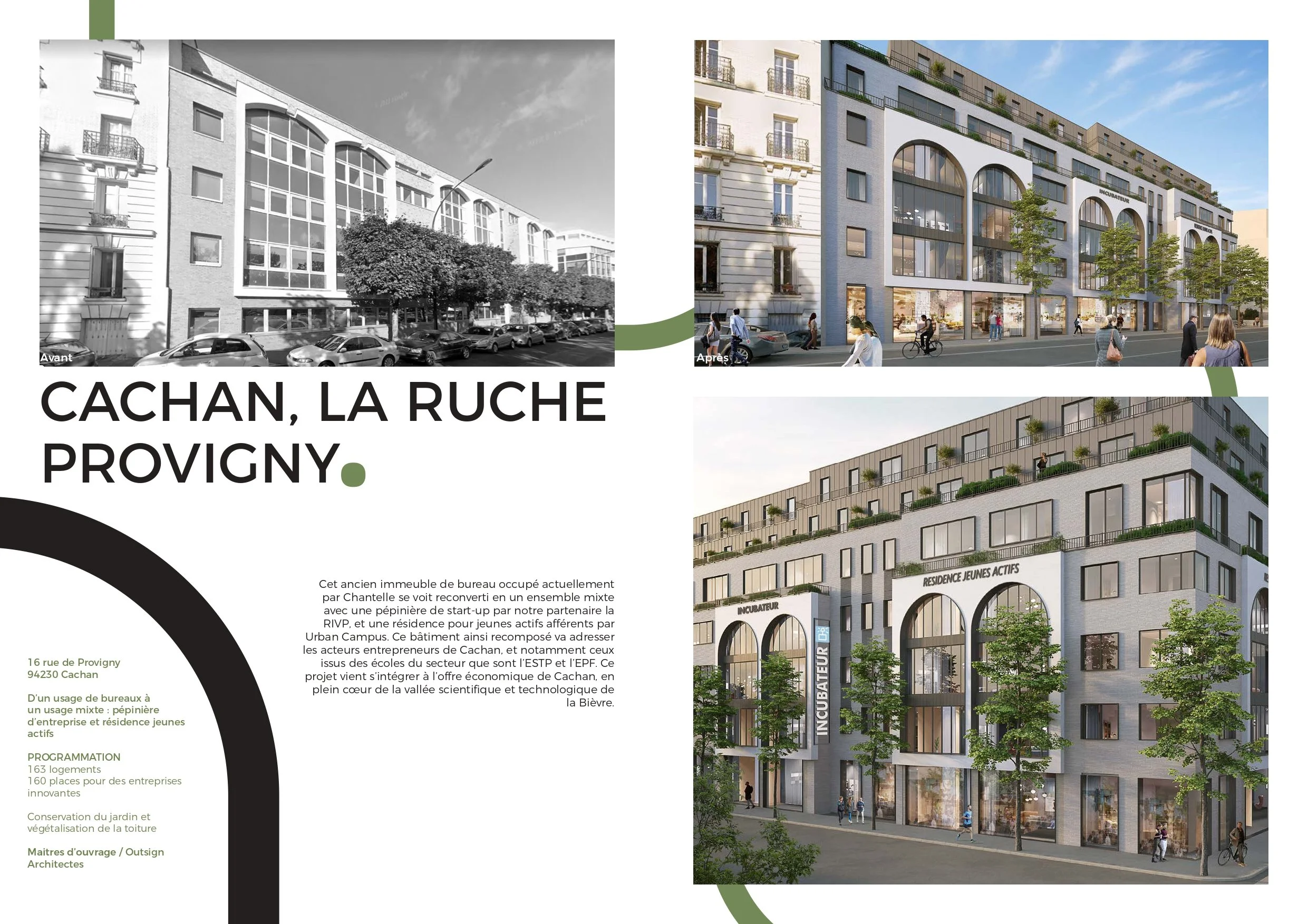 Immeuble de bureaux libéré par le groupe Chantelle qui a réduit son périmètre aux immeubles mitoyens, le projet proposait de revitaliser ce secteur de Cachan en liaison avec la forte présence d’écoles d’excellence à proximité : réalisation d’un ensemble mixte comprenant un incubateur de start up et une résidence pour jeunes actifs.